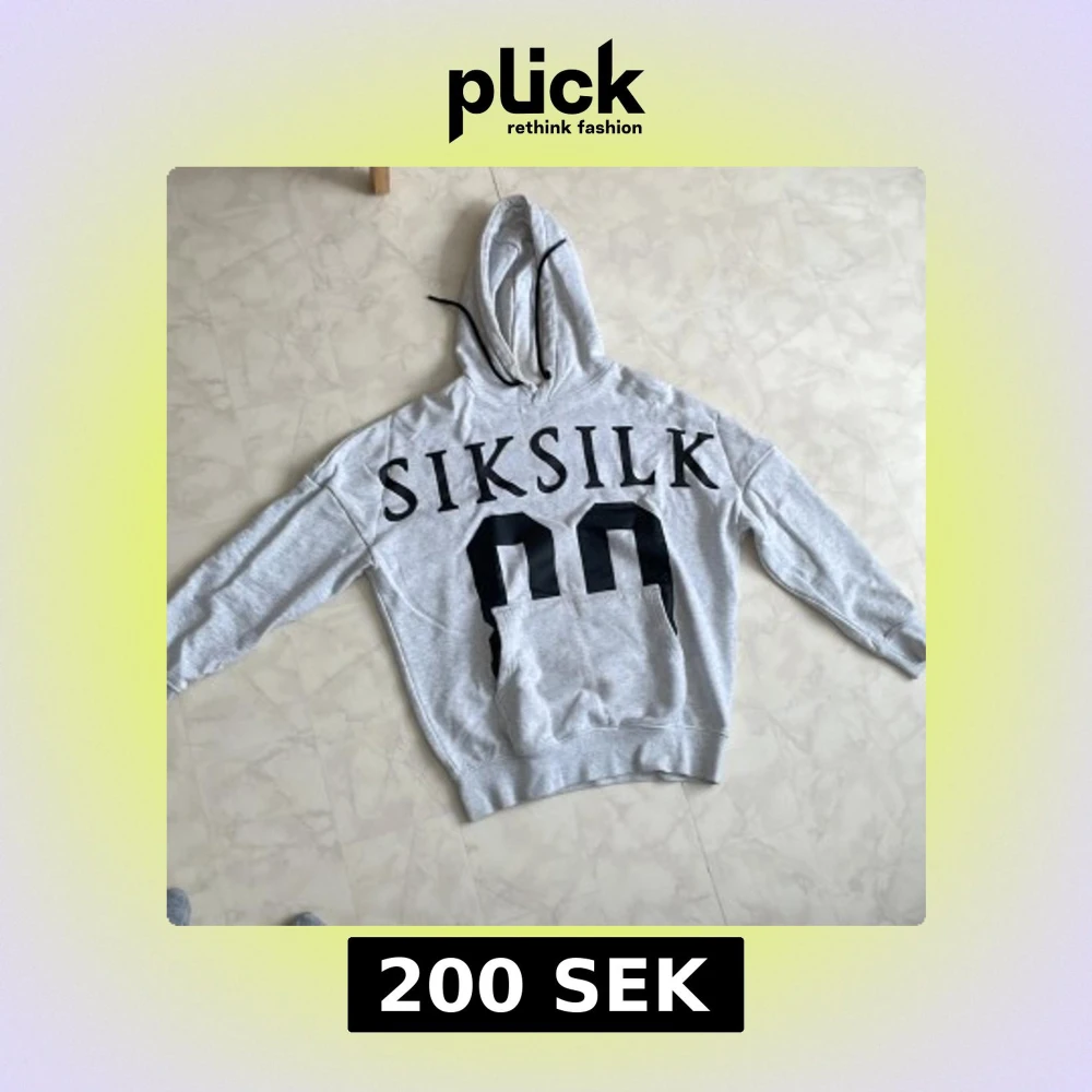 Snygg ljusgrå hoodie från SikSilk i storlek XS. Stor svart logga och siffror på framsidan, klassisk känguruficka och huva med svarta snören. Den har en liten fläck på insidan av luvan, men går bort enkelt med rätt tvättmedel. För mer frågor kontakta!