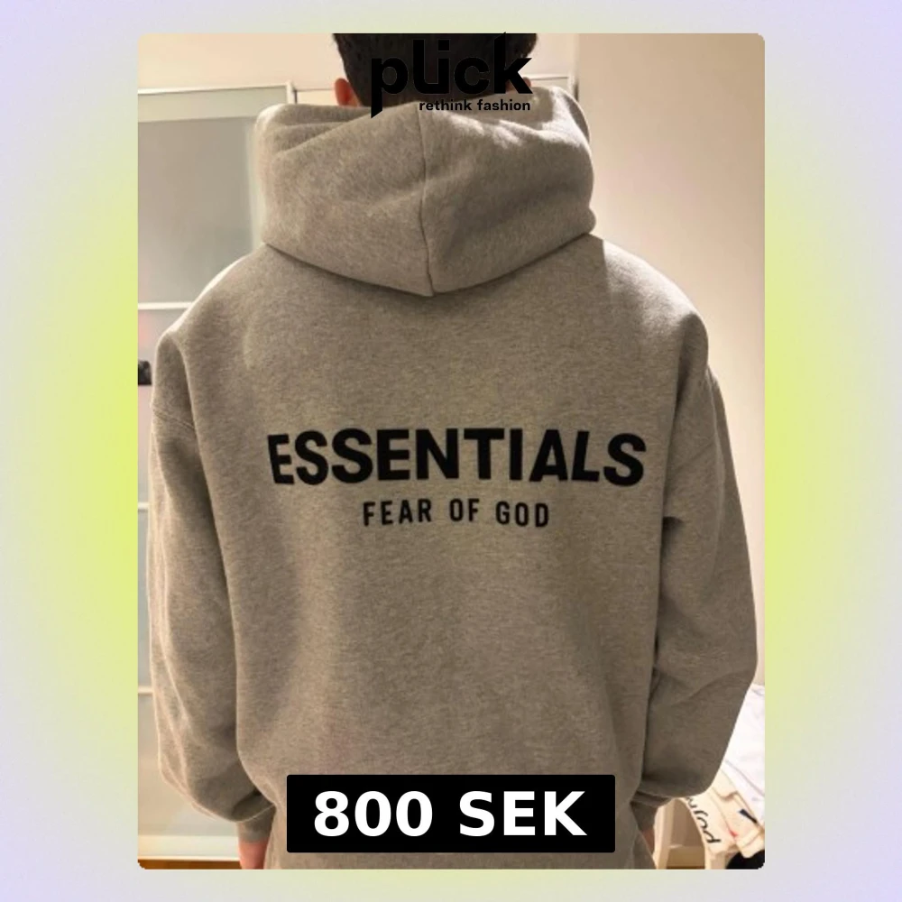 Säljer en grå hoodie från Essentials Fear of God i storlek xs med stor logga på ryggen och mindre logga på bröstet. Hoodien har huva och en stor magficka framtill. Tillverkad i mjukt sweatshirtmaterial, perfekt för en chill och stilren look.