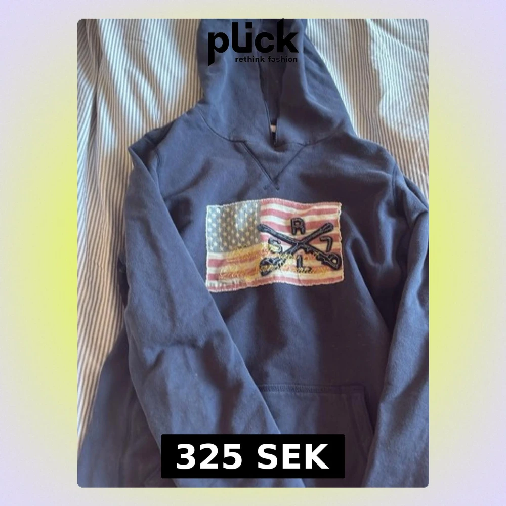 Mörkblå hoodie från Polo Jeans Company by Ralph Lauren med stor huva och amerikansk flagga med broderade detaljer på bröstet. Tillverkad i mjukt bomullsmaterial och har en klassisk känguruficka framtill. Perfekt för en avslappnad och cool stil.