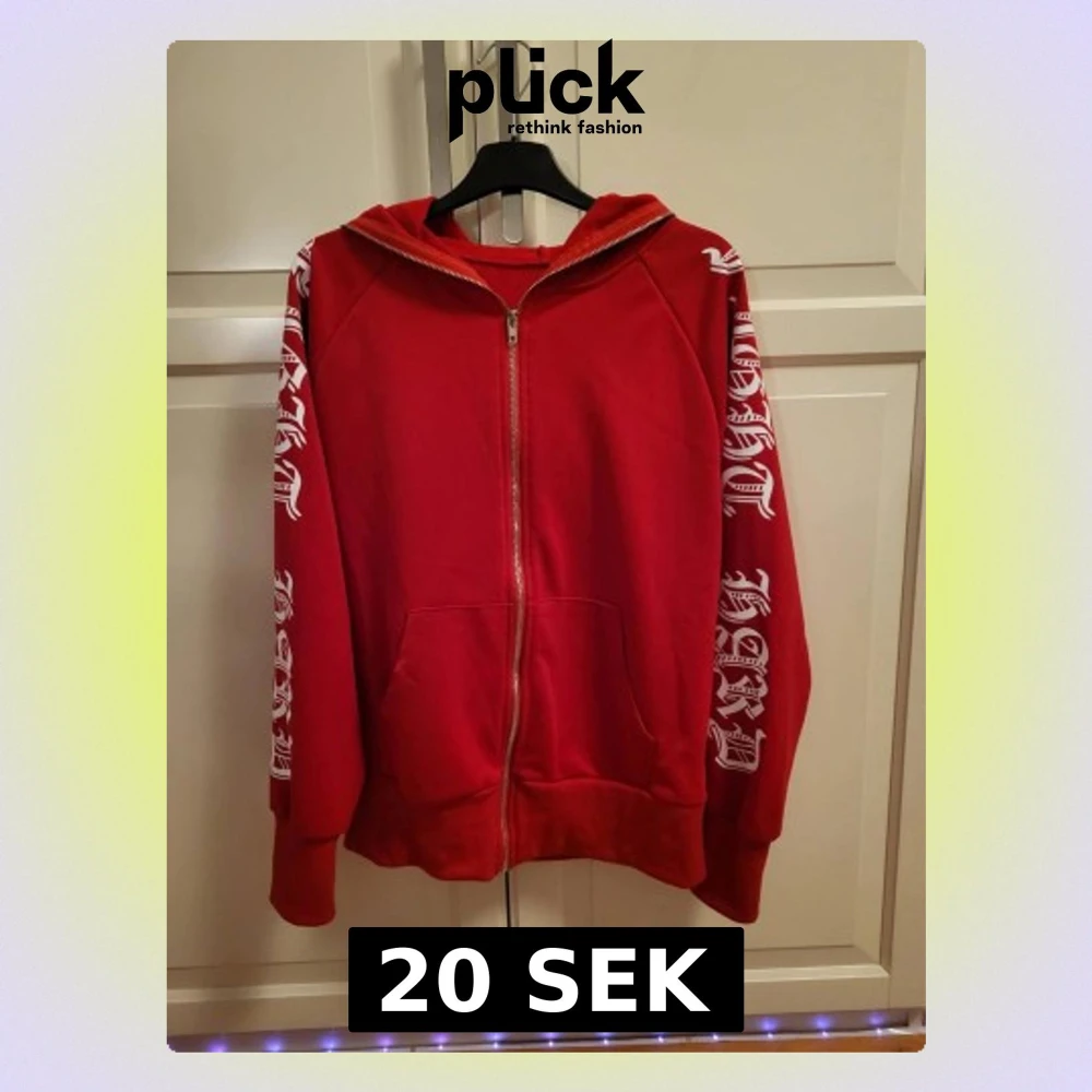 Röd hoodie med dragkedja framtill och stor ficka på magen. Ärmarna har vitt tryck i gotisk stil längs hela längden. Klassisk huva och ribbade muddar vid ärmslut och nederkant. Perfekt för en streetwear-look.