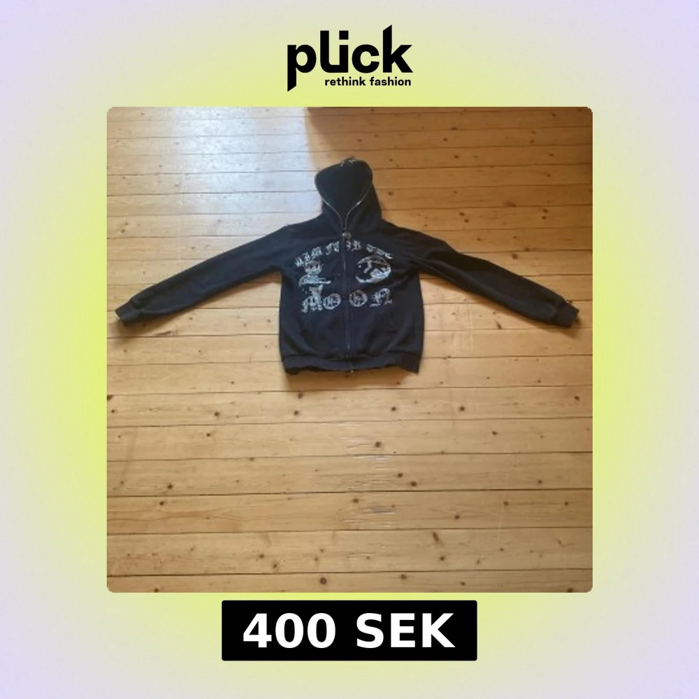 Svart hoodie med huva från Aim For The Moon i storlek XS. Framsidan har glittriga stenar och tryck med texten 'AIM FOR THE MOON' samt coola motiv. Dragkedjan har en unik metallberlock. Perfekt för dig som gillar streetstyle och detaljer.