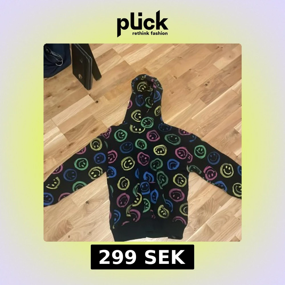 Cool svart hoodie från Junkyard med färgglada smileys i grönt, blått, rosa och gult över hela tröjan. Tröjan har huva och en stor magficka. Perfekt för dig som gillar streetwear. Tröjan är i storleken XS men är större än vad man tror, passar t.ex även dig som har S. Pris kan diskuteras.