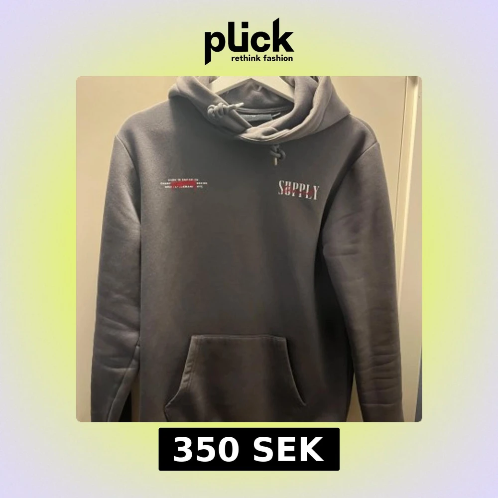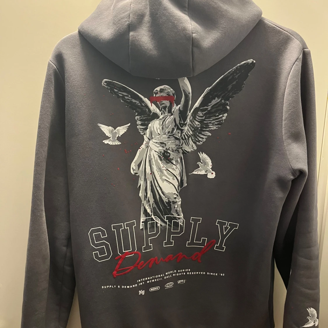 Mörkgrå hoodie från Supply & Demand med stor grafisk ängel och text på ryggen samt mindre tryck fram. Tröjan har huva med snörning och en stor magficka. Skön och avslappnad passform, perfekt för kalla sommarnätter