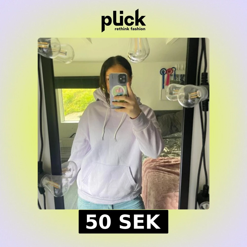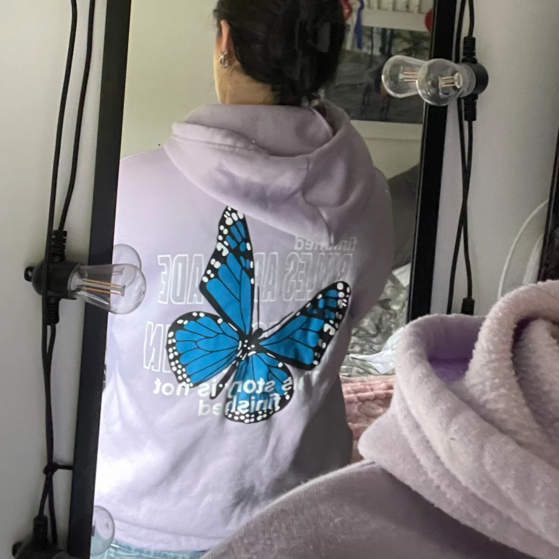 Säljer en ljuslila hoodie med stor blå fjäril och vit text på ryggen. Hoodien har huva med snörning och en klassisk känguruficka framtill. Perfekt för dig som gillar unika tryck och sköna, avslappnade plagg.