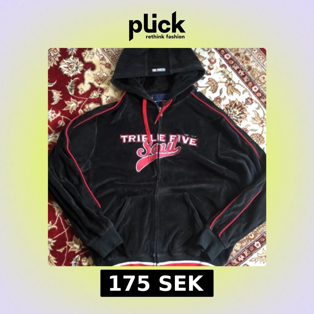 Svart hoodie i mjuk velour från Triple Five Soul med röda detaljer och broderad logga framtill. Tröjan har huva, dragkedja och fickor samt röda ränder längs ärmarna och ribbade muddar med röd-vit rand vid midjan. Kan mötas i sthlm.