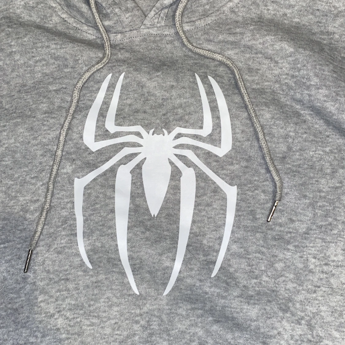 En ljusgrå spiderman Hoodie, har används 2-3 gånger. Den har mjukt material inuti, materialet på hoodien är väldigt bra.