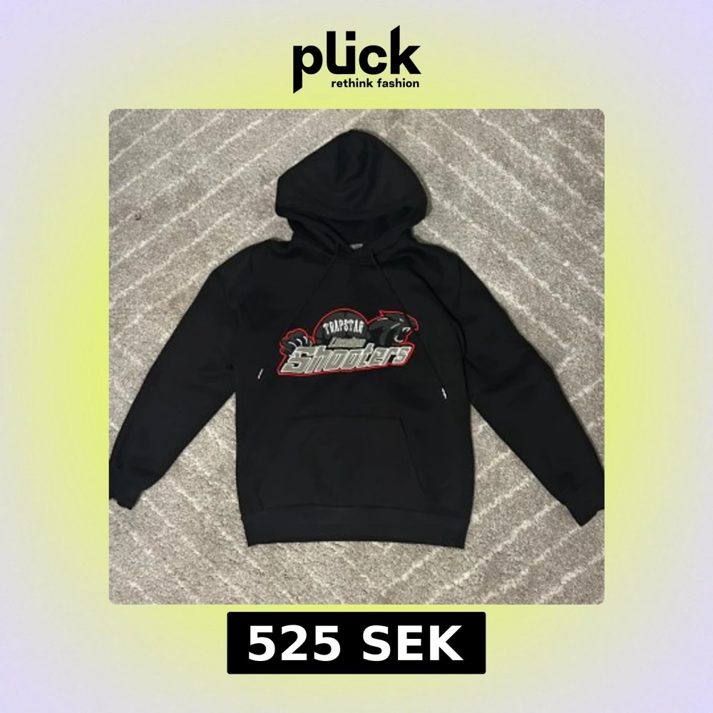 Svart hoodie från Trapstar med stort broderat 'London Shooters'-motiv på bröstet i grått, vitt och rött. Tröjan har huva med snörning, ribbade muddar och klassisk känguruficka. Perfekt för dig som gillar streetwear och vill sticka ut. (Finns med byxor också)