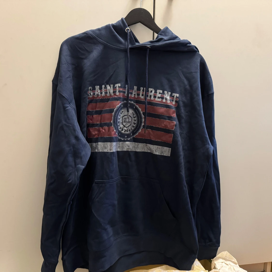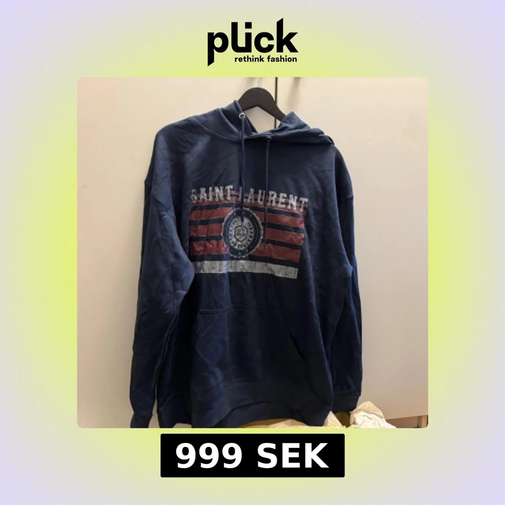Säljer en marinblå hoodie från Saint Laurent med stort tryck framtill i rött, vitt och blått. Tröjan har huva med snörning och en stor magficka. Perfekt för dig som gillar streetwear och vill ha en snygg och bekväm look.
