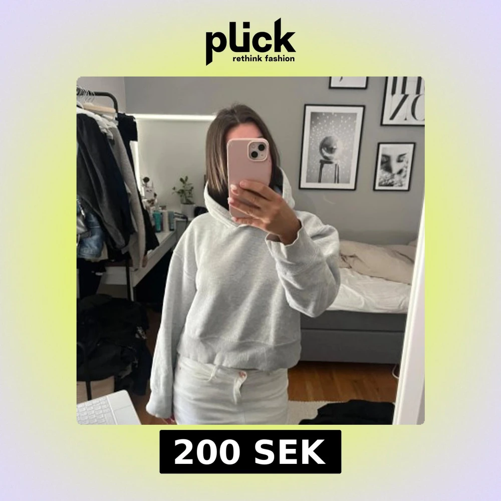 Säljer en ljusgrå croppad hoodie med huva och långa ärmar. Tröjan har en relaxed fit och är tillverkad i mjuk bomullsmix, perfekt för chill dagar. Enkel och stilren design som passar till det mesta.