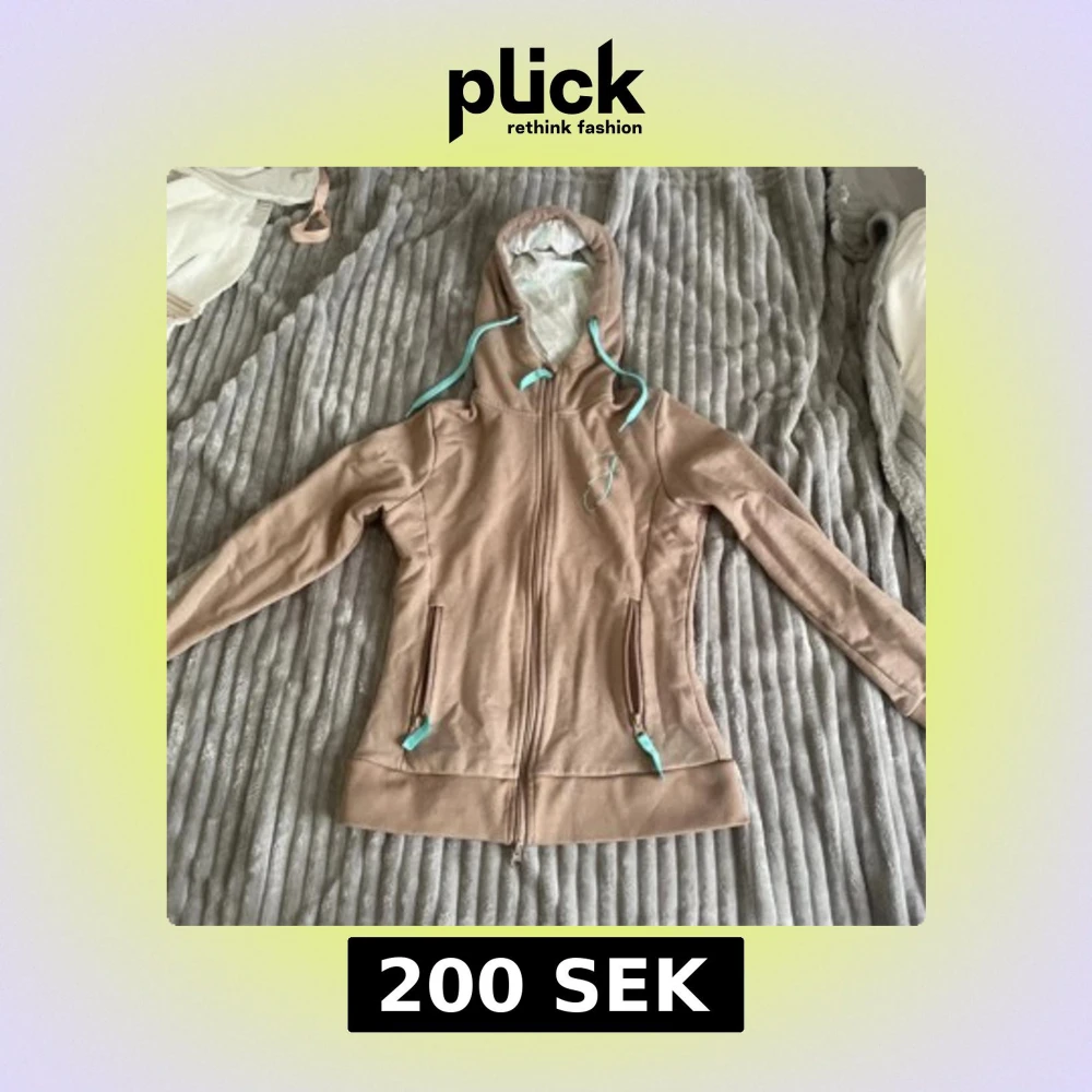 Säljer en beige hoodie från Equestrian Stockholm med turkosa detaljer och dragkedja. Jackan har huva med mönstrat foder, broderad logga på bröstet och text på ärmen. Perfekt för dig som gillar stilren ridstil.