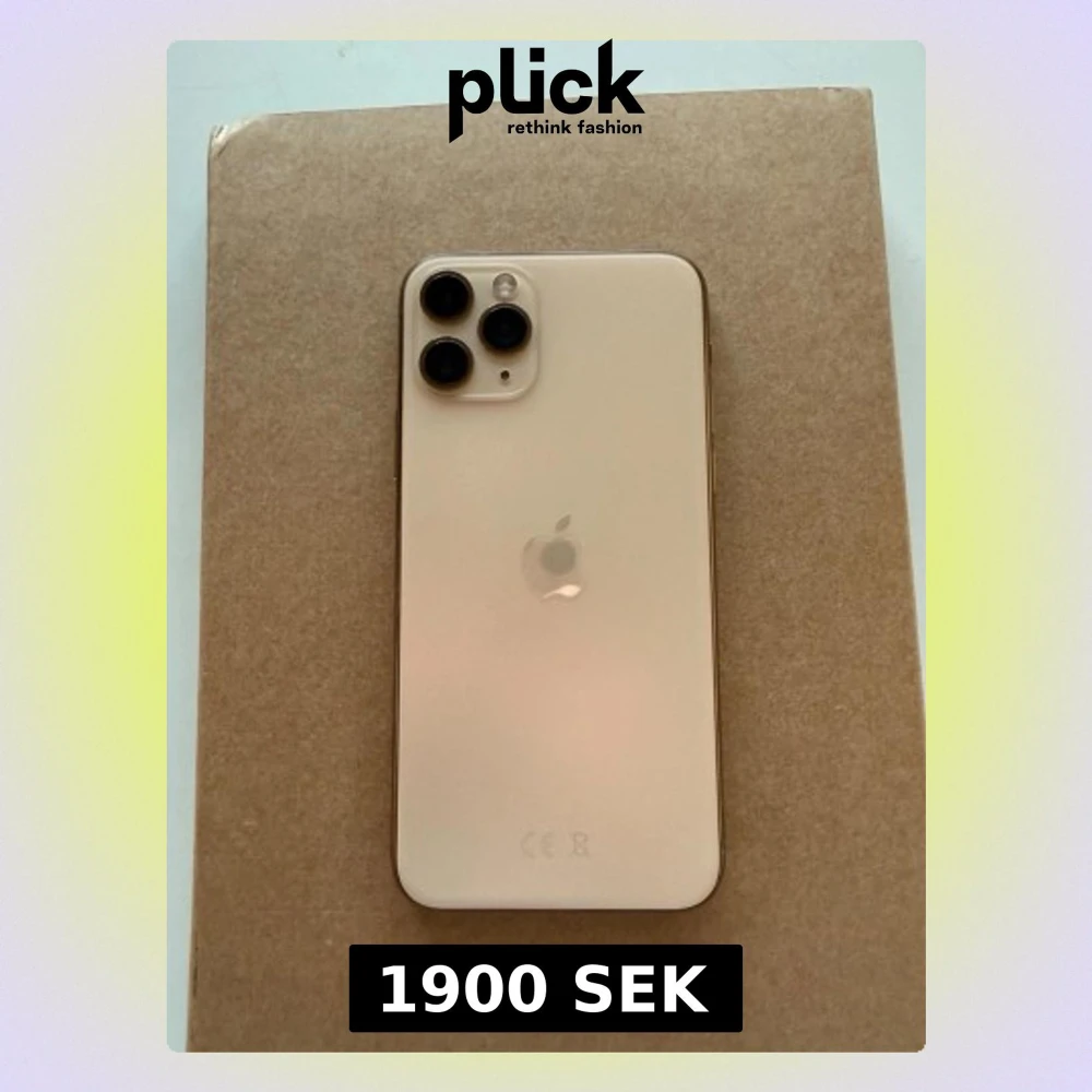 iPhone 11 Pro i guldig färg med snygg glasbaksida och tre kameror på baksidan. Telefonen har en stor skärm med tunna kanter och rundade hörn. Apple-loggan syns tydligt på baksidan och mobilen känns riktigt premium med sin stilrena design.