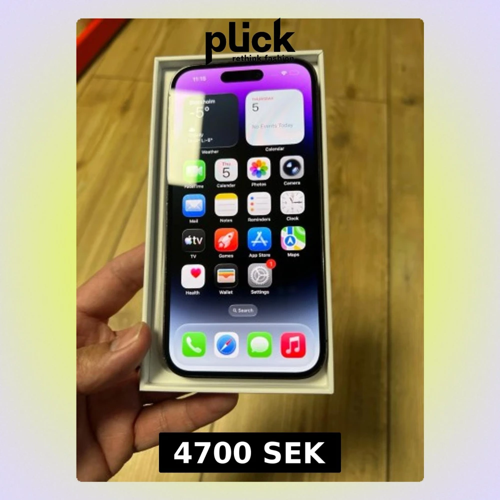 Säljer en svart iPhone 14 Pro med 128GB lagring. Telefonen har en snygg, modern design med rundade hörn och en stor OLED-skärm. Tillverkad i glas och metall, levereras i originalkartong. Perfekt för dig som vill ha Apples senaste teknik och stilren look.