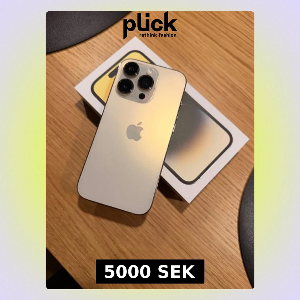 Snygg iPhone 14 pro i guld med originalkartong. I mycket bra skick då jag alltid haft skärmskydd och mobilskal samt varit väldigt rädd om den. Det är 128gb och har några små repor vilket syns på bilderna. Kvitto finns självklart och telefonen är i mycket gott skick och har okej batterikapacitet. Säljes då jag köpt iPhone 17. Medföljer 2 mobilskal och 2 skärmskydd, samt orörd originalmaterial med laddare.