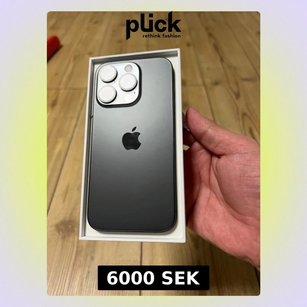 Snygg iPhone 15 pro med stilren design och tre stora kameror på baksidan. Tillverkad i glas och metall med Apples ikoniska logga. Kommer i originalkartong och har en modern, kantig form som känns riktigt premium.