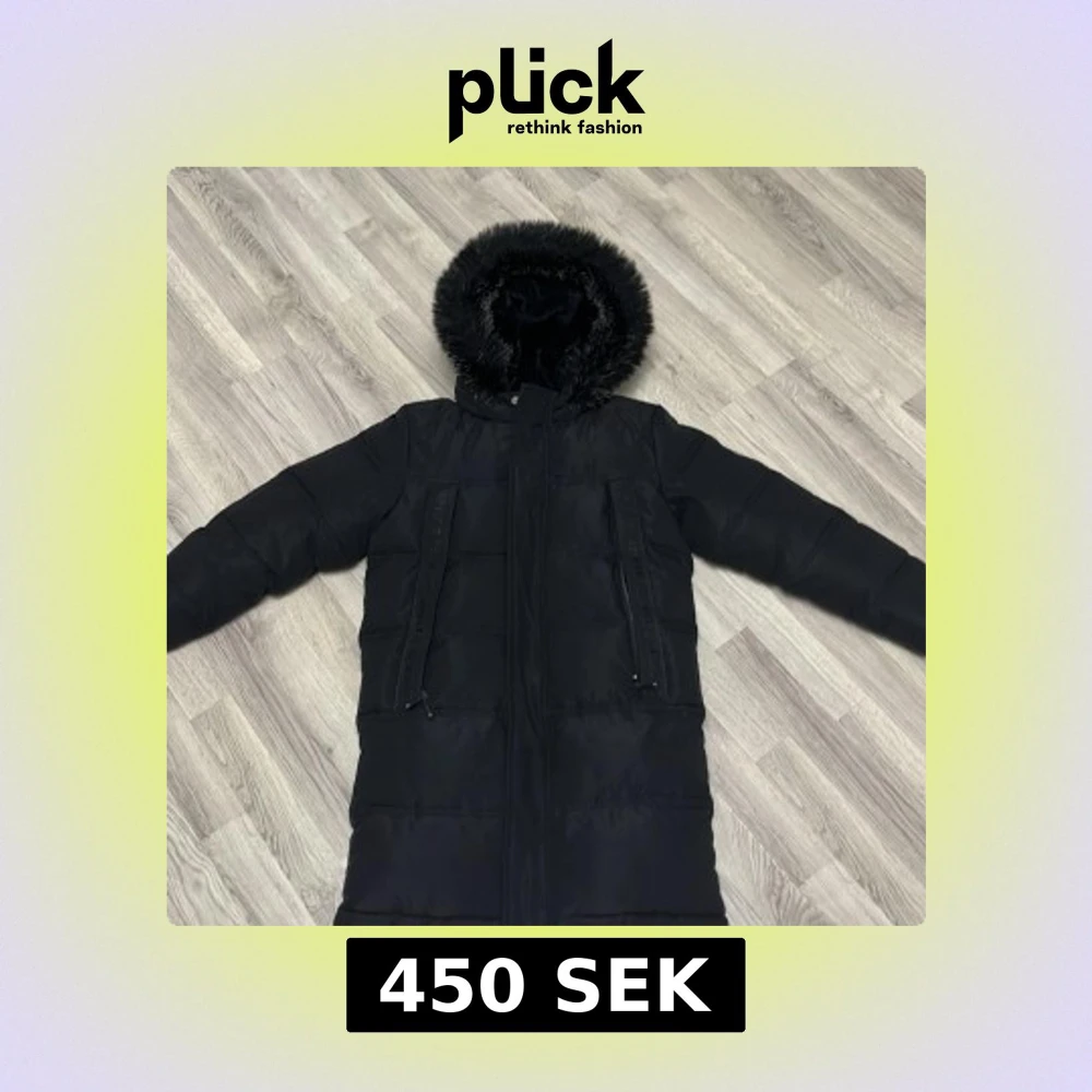 Lång svart pufferjacka från Supply & Demand med huva och fuskpäls. Jackan har två snedställda dragkedjefickor framtill och en stor logga på ärmen. Insidan av huvan är fodrad med mjuk pälsimitation för extra värme.