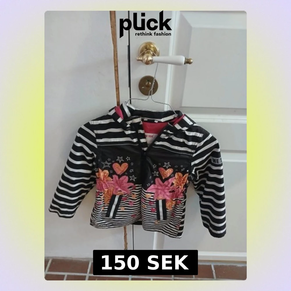 Snygg svartvit randig jacka från Me Too med färgglada blommor, hjärtan och stjärnor på framsidan. Jackan har dragkedja, lång ärm och rosa innerfoder. Perfekt för dig som vill sticka ut lite extra.
