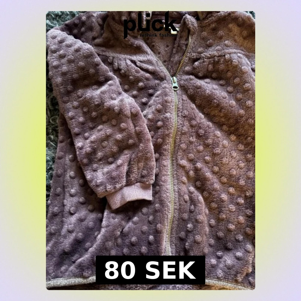 Supermjuk fleecejacka i plommonlila från Pompdelux, storlek 128. Jackan har ett prickigt mönster, gosig krage och glittriga kanter. Dragkedja framtill och ribbade muddar vid ärmslut. Perfekt för dig som gillar mysiga och coola detaljer.