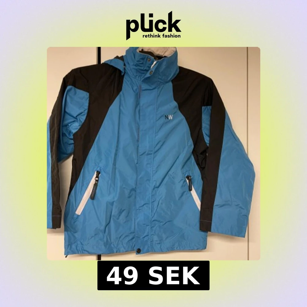 Snygg blå och svart vindjacka från NW med praktisk huva och dragkedja. Jackan har långa ärmar och två fickor med dragkedjor. Perfekt för blåsiga dagar.