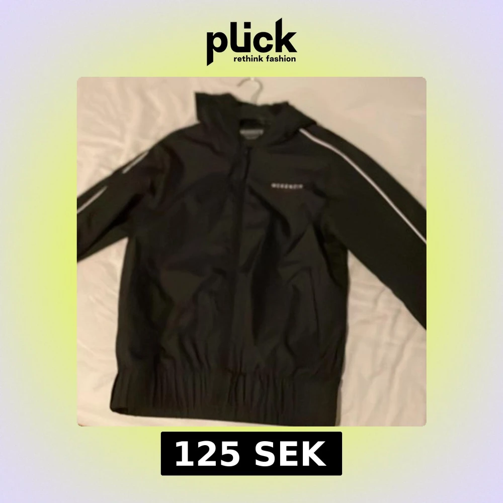 Säljer en stilren svart vindjacka från McKenzie. Jackan har en dragkedja framtill och vita detaljer längs ärmarna. Perfekt för blåsiga dagar och har en sportig look. Passar bra för en casual stil.