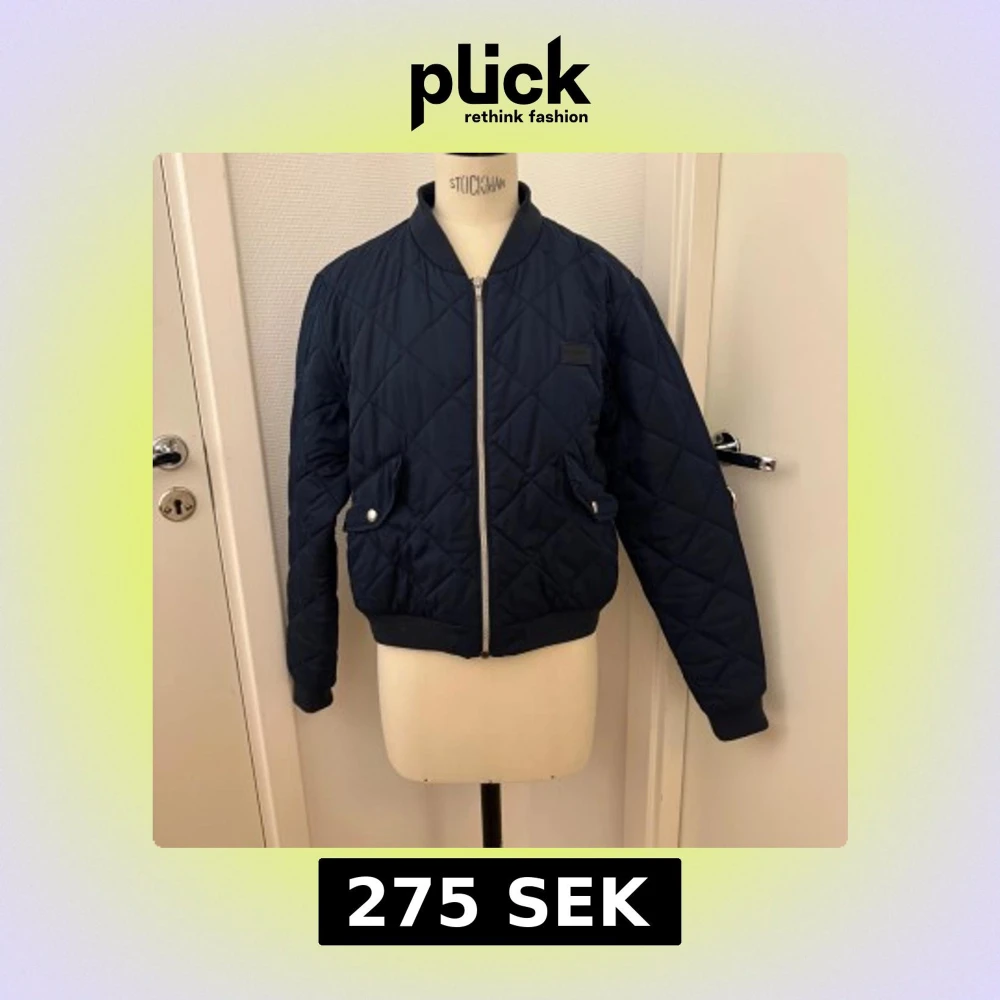 Quiltad bomberjacka från Marqy i marinblått med silvrig dragkedja och ribbade muddar. Jackan har två fickor med lock och tryckknappar samt ett diskret märke på bröstet. Tillverkad i 100% polyester. Hämtas i Hägersten om du vill slippa frakt. Var även uppmärksam på när Plick erbjuder fraktfritt ibland på dyrare plagg. Följ mig gärna. Har mycket att lägga ut i olika storlekar!