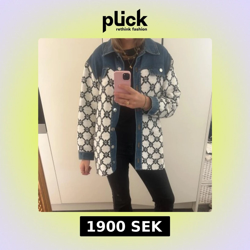 Säljer en snygg overshirt med blå denimkrage och axelparti. Jackan har vit bas med svart mönster, knappar framtill och långa ärmar. Perfekt för dig som vill ha en unik och trendig look.