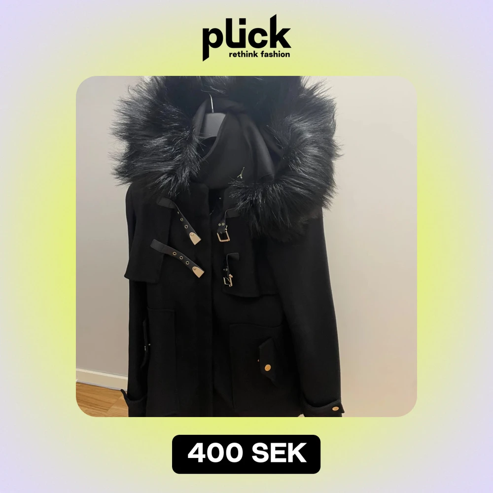 Säljer en elegant svart kappa med huva och pälsdetaljer. Den har snygga spännen framtill och är perfekt för kyliga dagar. Passar både till vardags och festliga tillfällen. Ett måste för vintern!
