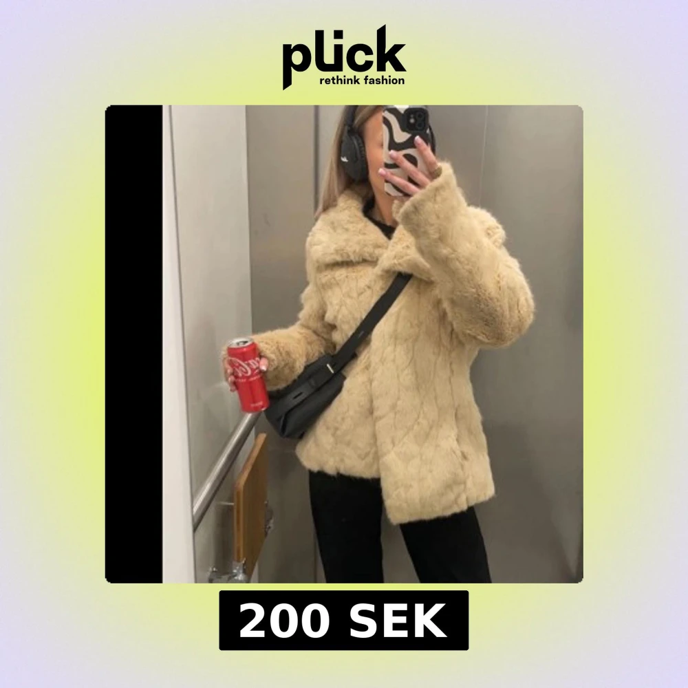 Säljer en fluffig beige pälsjacka med stor krage. Jackan har lång ärm och stängs framtill. Perfekt för kyligare dagar och ger en lyxig känsla till outfiten.