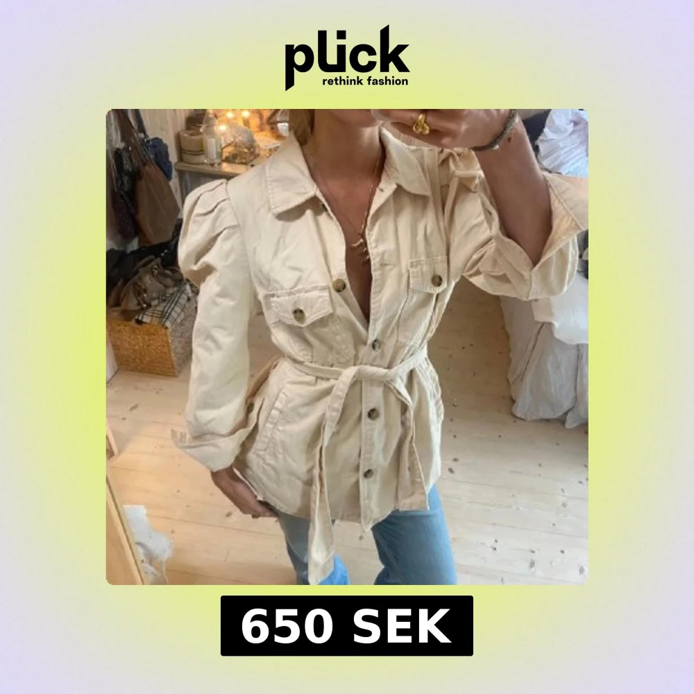 Snygg beige overshirt med puffärmar, knappar framtill och knytskärp i midjan. Jackan har två bröstfickor med lock och markerad krage. Perfekt för lager-på-lager och ger en trendig siluett.