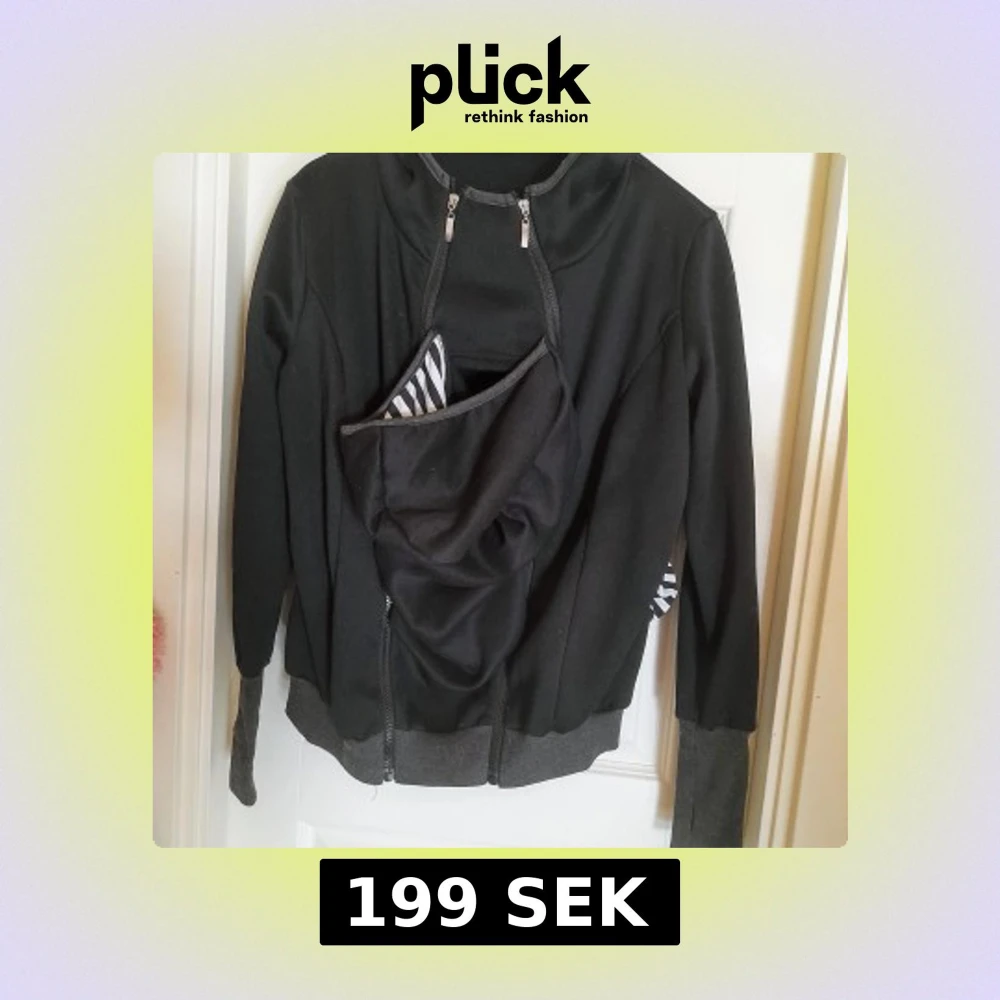 Svart hoodie med grå muddar och huva. Har en smart bärinsats med svartvitt zebramönstrat foder, perfekt för att bära barn. Dragkedjor framtill för enkel öppning och stängning. Mjuk och bekväm, passar till vardags. Jag tror att den är hemsydd då det inte finns lappar i. Bärtröja. Bärjacka. Den passar en small. Eventuellt en medium med. Använd en gång