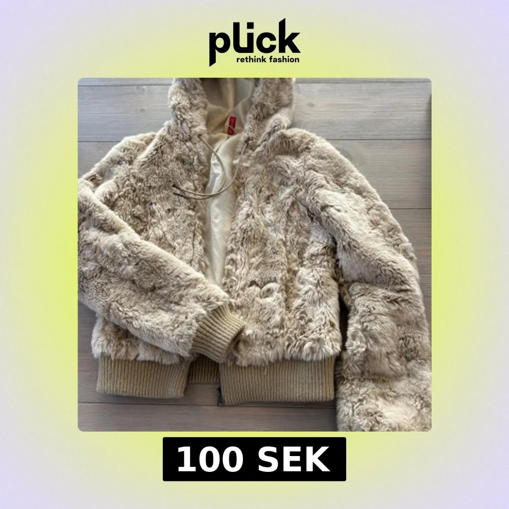Mysig beige pälsjacka från H&M Divided i storlek 36. Jackan har huva, ribbade muddar och dragkedja framtill. Perfekt för dig som vill ha en fluffig och trendig look under kyliga dagar.
