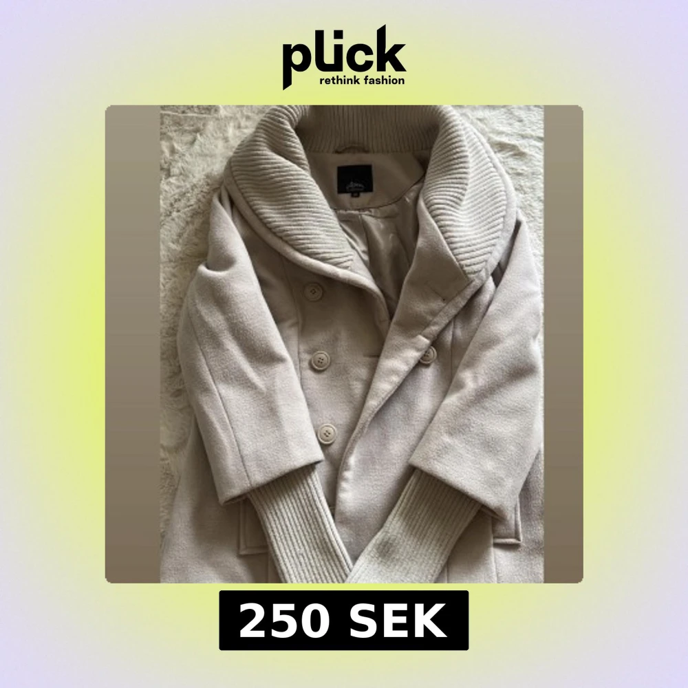 Snygg beige kappa med dubbelknäppning och bred ribbad krage. Jackan har ribbade muddar vid ärmsluten och två fickor framtill. Perfekt för dig som vill ha en stilren och mysig jacka med coola detaljer.