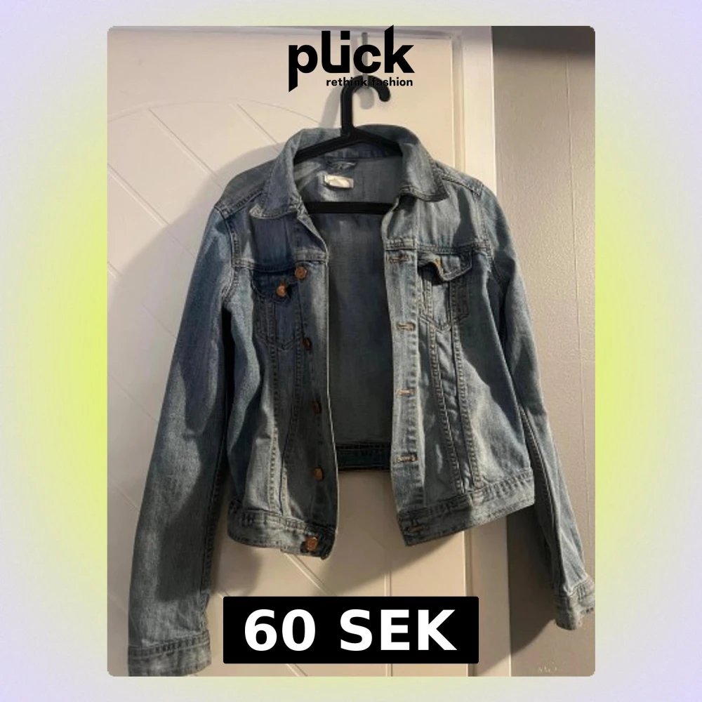 Snygg ljusblå jeansjacka med klassisk krage och bröstfickor. Knapparna har rostat