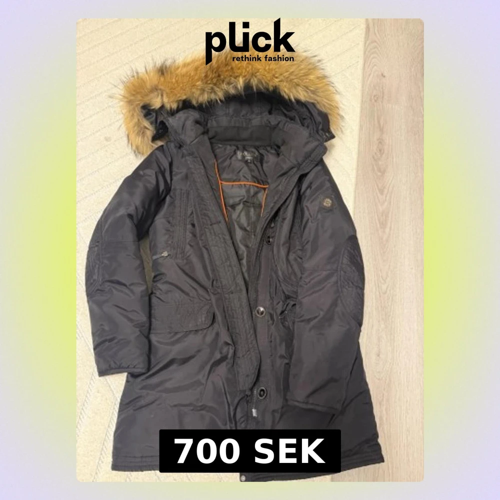 Parkajacka från Hollies i svart med snygg fuskpäls på huvan och orange detaljer på insidan. Jackan har långa ärmar, flera fickor och stängs med både dragkedja och knappar. Perfekt för kalla dagar och har en klassisk, stilren look.