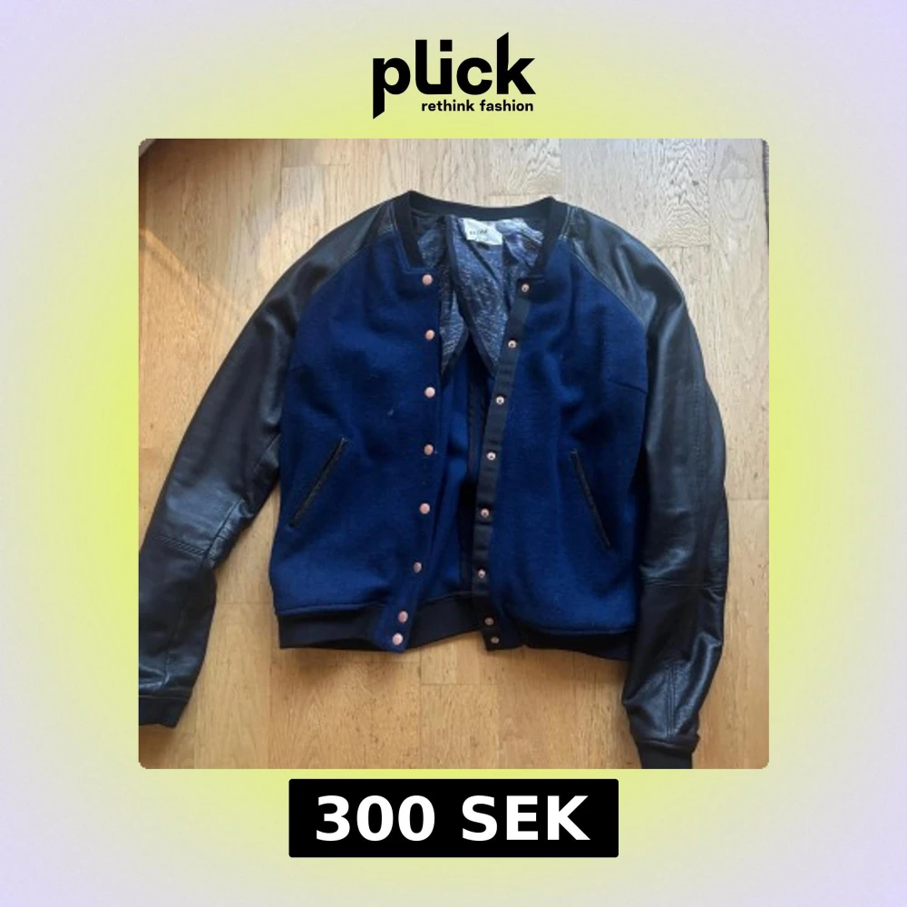 Snygg bomberjacka med marinblå ullig kropp och svarta ärmar i äkta läder . Jackan har kopparfärgade knappar, svarta ribbade muddar och två fickor framtill. Supercool och håller värmen inför hösten ❣️hör av er vid frågor ❣️den är oversized men faller snyggt