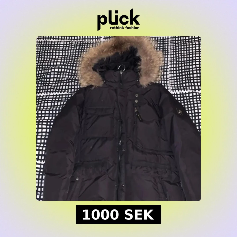 Säljer en svart dunjacka från Hollies med stor huva och fluffig pälsdetalj. Jackan har flera fickor framtill, dragkedja och knappar. Perfekt för kalla dagar och riktigt snygg streetstil. Nypris 5499