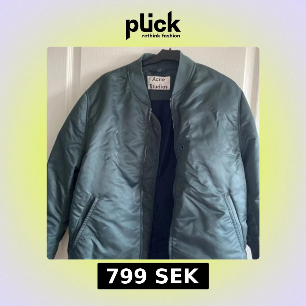 Snygg grön bomberjacka från Acne Studios med klassisk ribbad krage och ärmslut. Jackan har dragkedja framtill och två snedställda fickor. Materialet är glansigt och känns riktigt modernt. Perfekt för dig som vill ha en stilren och trendig look.
