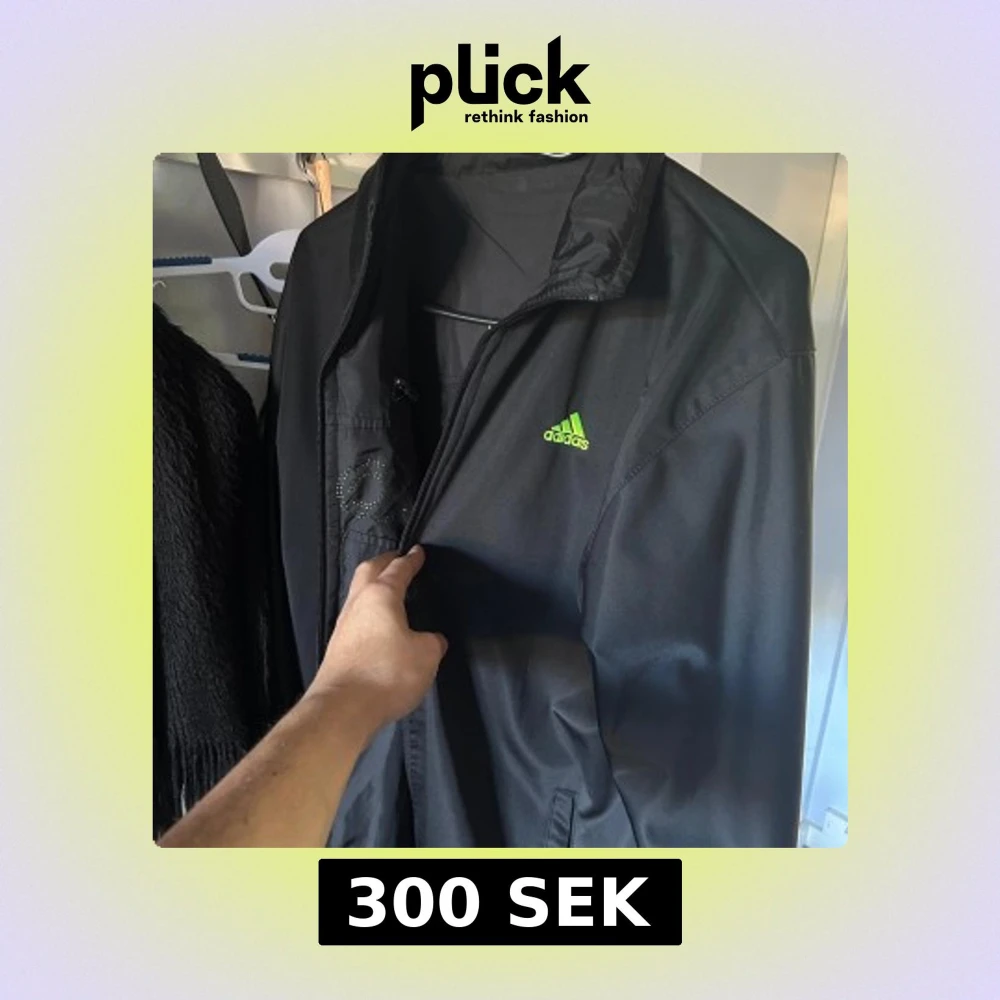 Svart zip-tröja från Adidas med limegrönt logotryck på bröstet och ryggen. Jackan har dragkedja framtill, hög krage och en bröstficka med dragkedja. Materialet är lätt och syntetiskt, perfekt för blåsiga dagar. Snygg detalj med Adidas-tryck i små prickar på framsidan. Går att ha på 2 håll, doublesided.