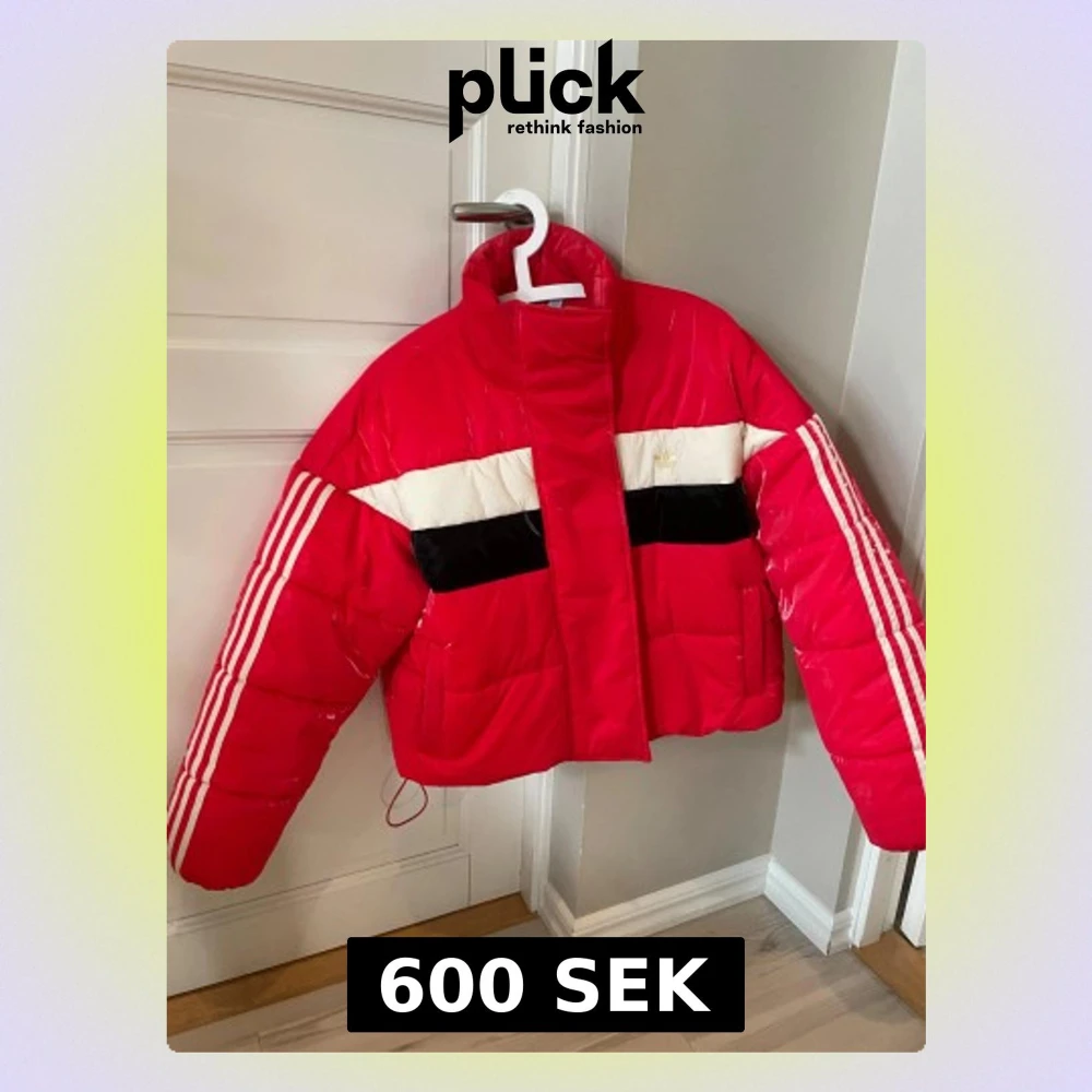 Säljer en fet röd pufferjacka från Adidas med vita och svarta detaljer samt klassiska tre ränder längs ärmarna. Jackan har hög krage, broderad logga på bröstet och är vadderad för extra värme. Perfekt för dig som vill sticka ut i vinterkylan.