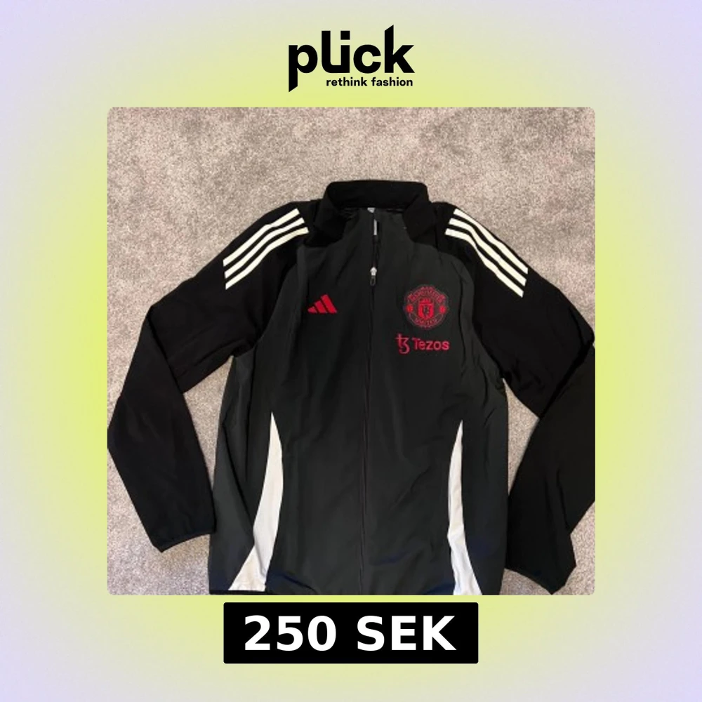 Svart vindjacka från Adidas med Manchester United-logga och Tezos-tryck i rött på bröstet. Jackan har vita ränder på axlarna, hel dragkedja framtill och långärmad design. Perfekt för fotbollsfans som vill ha en sportig look.