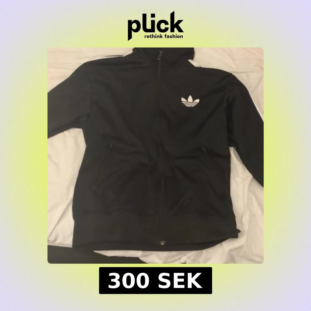 Säljer en svart jacka från Adidas med dragkedja och det klassiska logotypen på bröstet. Jackan har långa ärmar och vita ränder längs axlarna. Perfekt för en sportig look.