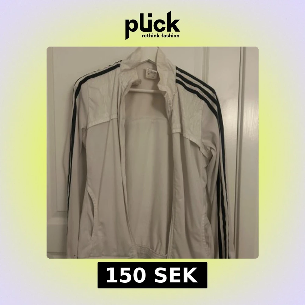 Säljer en vit vindjacka från Adidas i storlek S. Jackan har klassiska svarta ränder längs ärmarna, dragkedja framtill och två fickor. jackan har en sportig look med långärmad design. Funkar bra som träningsplagg.