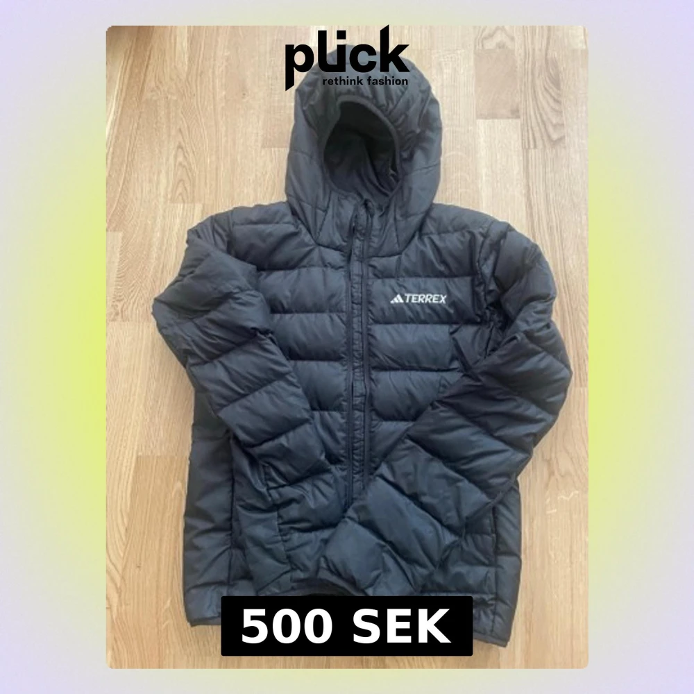 Svart dunjacka från Adidas Terrex med huva och dragkedja framtill. Jackan har quiltad design och logga på bröstet. Perfekt för kyliga dagar och enkel att matcha med olika outfits. Tyvärr så är dragkedjan lite krånglig längst ner så den går inte att stänga.