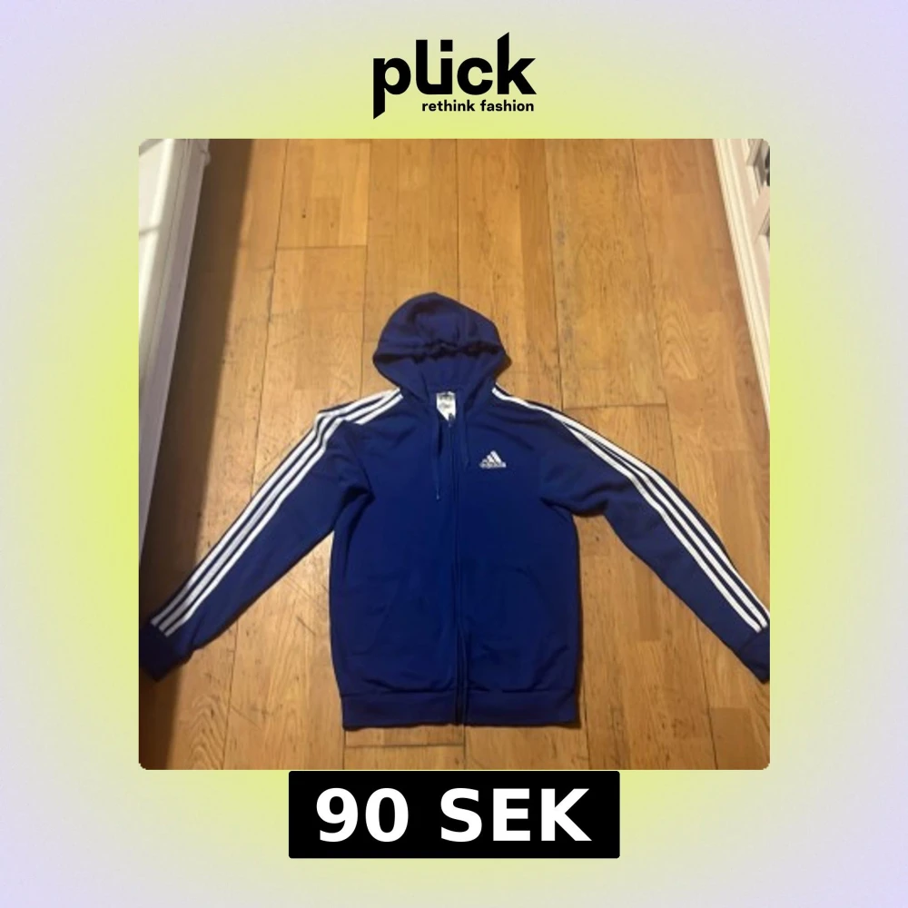 Säljer en blå huvtröja från Adidas med klassiska vita ränder längs ärmarna. Tröjan har en dragkedja framtill och en justerbar huva. Perfekt för en sportig look eller avslappnade dagar. 🏃♂️
