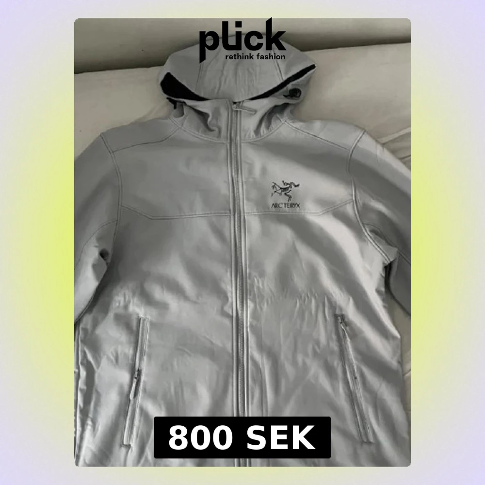 Arc'teryx vindjacka i grå med huva och hel dragkedja framtill. Finns i alla storlekar