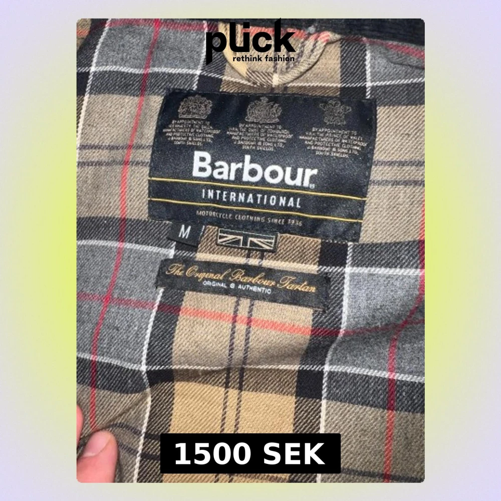 Säljer en svart Barbour International jacka med klassiskt rutigt foder i beige, grått och rött. Jackan har bälte i midjan, fickor med tryckknappar och detaljer i brunt på armbågarna. Märkespatch på bröstfickan och robust känsla, sparsamt använda och mycket väl omhändertagna