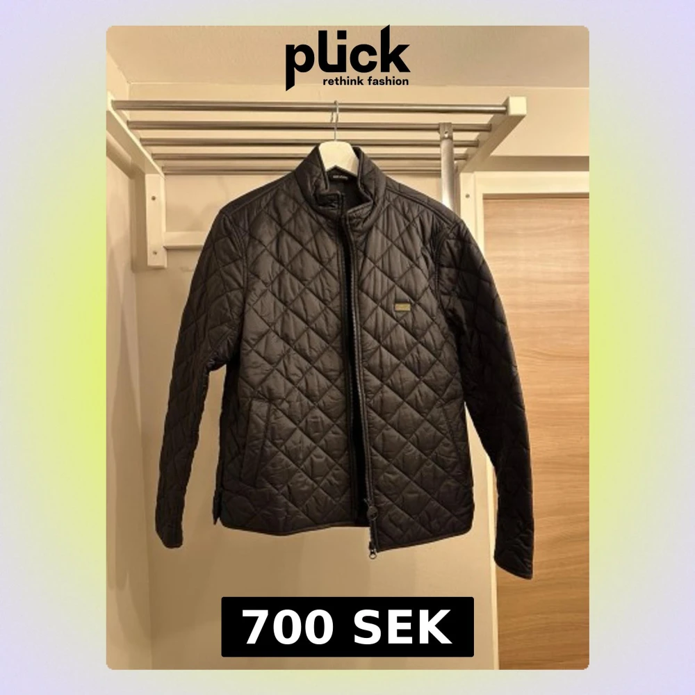 Snygg svart vindjacka från Barbour med quiltat mönster och hög krage. Jackan har dragkedja framtill, två sidofickor och en liten logotyp på bröstet. Perfekt för dig som vill ha en stilren och klassisk look. Äkta såklart. Använd vid ett fåtal tillfällen.