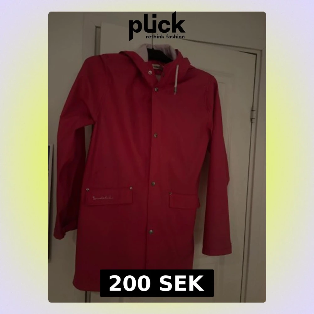 Säljer en snygg rosa regnjacka från Bondelid med huva och vita snören. Jackan har tryckknappar framtill, två stora fickor med lock och Bondelid-logga på ena fickan. Perfekt för blöta dagar och riktigt stilren look. I storlek 150/160.