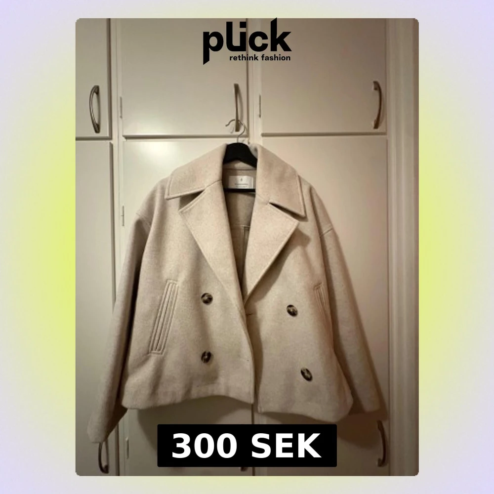 Säljer en beige skepparkavaj från Stradivarius med bred krage och dubbelknäppning. Jackan har en loose passform, långa ärmar och är tillverkad i mjuk ullmix. Snygga knappar framtill och stilrena fickor på sidorna. Perfekt för höst och vår. Använd 2 gånger.