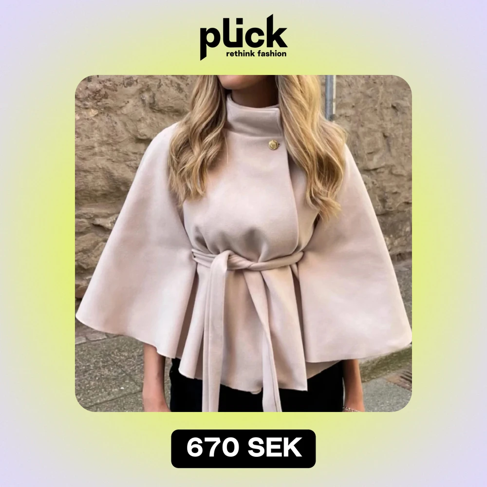 Säljer en superfin beige kappa med knytband i midjan. Den har en elegant cape-stil och en knappdetalj vid halsen. Helt oanvänd med prislapp på!