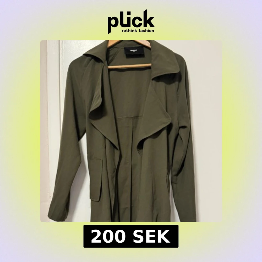 Snygg olivgrön trenchcoat från BikBok i storlek XS. Jackan har långa ärmar, bred krage och knytskärp i midjan för en clean och stilren look. Praktiska fickor framtill. Lätt material som passar till många outfits.
